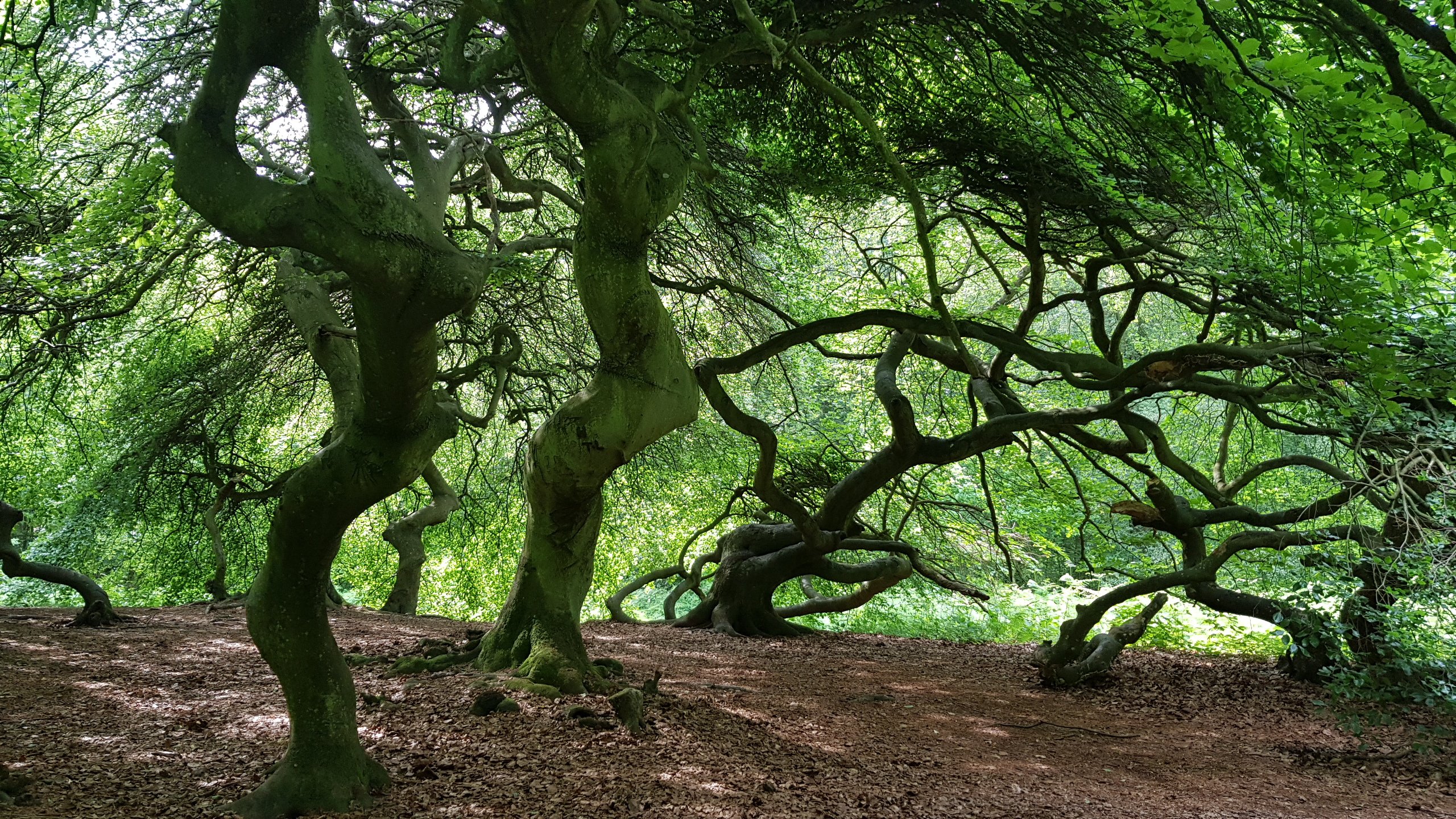 A Witches’ Forest. Follow this road up to this castle and there it is. The “road” is someone’s driveway BTW! We parked Elliot on the side of the driveway, mostly inside the forest and followed a very small sign into the forest. And there it was, The Witches’ Forest. Phenomenal. The trees here were definitely magic!